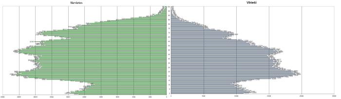 Kā redzams, no 1’037’451 vīriešu un 1’210’923 sieviešu 65 gadu vecumu bija sasnieguši 8’182 vīrieši un 12’477 sievietes, 80 gadu vecumu – 3’825 vīrieši un 9’290 sievietes, 90 gadu vecumu – 387 vīrieši un 1’519 sievietes, savukārt 100 un vairāk gadus veci bija 57 vīrieši un 191 sieviete. Grafiks parāda arī to, ka būtiskas iedzīvotāju skaita atšķirības starp dzimumu grupām parādās 45 gadu vecumā, un tas noved pie nākamā jautājuma.