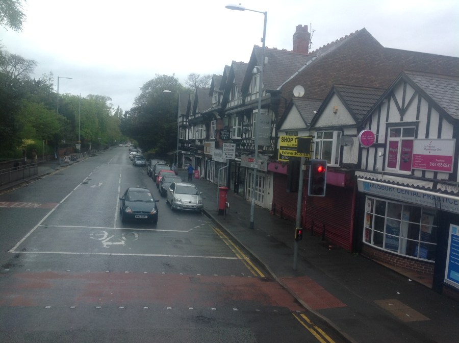 Ceļā no viesnīcas uz Mančestras centru. Skats no autobusa 2. stāva.