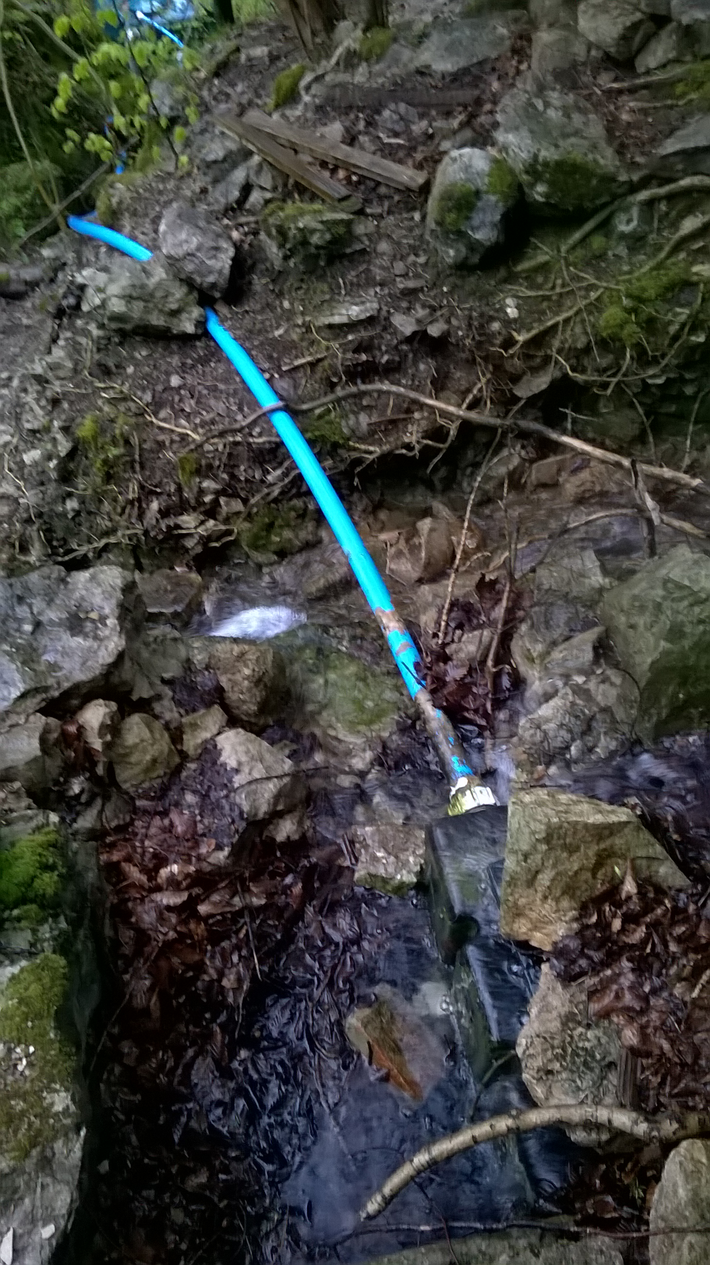 Ūdens savākšanas punkts, no kura caurule strauta ūdeni novada uz lielo mucu un tālāk lejā uz mājām