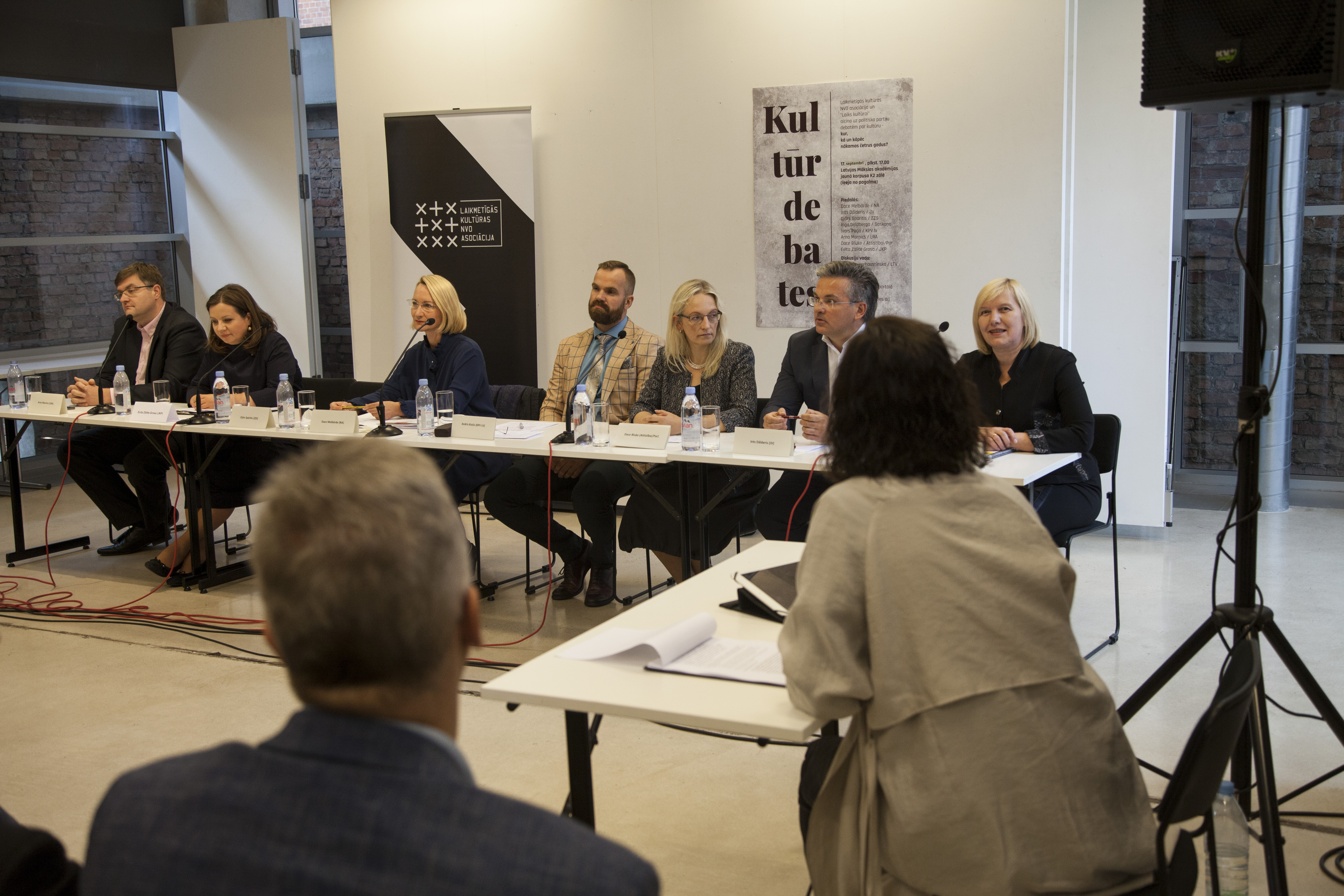 13. Saeimas vēlēšanu kandidātu sarakstu pārstāvji Kultūrdebatēs. No kreisās: Arno Marnics (Latvijas Reģionu Apvienība), Evita Zālīte-Grosa (Jaunā konservatīvā partija), Dace Melbārde (Nacionālā apvienība), Andris Kivičs (“KPV LV”), Dace Bluķe (“Attīstībai/Par!”), Ints Dālderis (Jaunā Vienotība) un Inga Goldberga (“Saskaņa”).